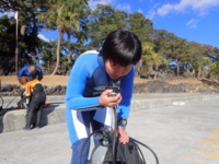 | 朝9時にダイブドリーム集合、受付、申込書のご記入後、当日のスケジュールの説明。忘れているダイビングの基本動作や圧力障害等、大切なことを思い出してもらうための説明を行います。 | ウエットスーツに着替え、最初にスーツ浮力の確認をします。久しぶりのダイビングですから、少しずつ慣らしていきます。 | 次に3点セットの使用方法の再トレーニング。Cカードを取得するコースでは教わっていなかったこともあるかもしれませんが、ダイビングの基礎はスキンダイビングにあります。 |