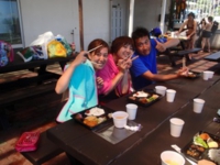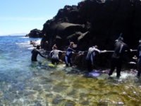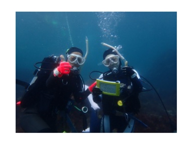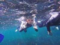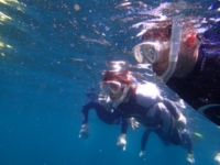 | ウエットスーツの浮力があるから、身体は沈む心配はありません。水面から海底を覗くと驚くほど沢山の魚達が泳いでいる姿を見ることが出来るはずです。 | 海でのスノーケリングの時間もあっという間に過ぎてしまうでしょう。伊豆の海に沢山の魚達が居る事にきっと驚いてしまうはずです。午後からの体験スキューバが楽しみです!! | スンーケリングも終わり、お楽しみ、海を眺めながらのランチタイム。午後からのスキューバダイビングの話を聞きながら、心はすでに海の中です!! |