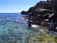 | 初めてフィンを履いて、水の中で動かしてみましょう!! 水の抵抗で足が重く感じますが、その抵抗で泳ぐ事が出来るのです。足の動かし方の説明を聞いて、デモンストレーションを観て、そして動かしてみましょう!! | いよいよ実際に泳いでみます。足の力を抜いて軽く大きく動かしてみると、なんと少ない力で泳ぐ事が出来るのです。水泳が苦手の人でも驚くほど楽に泳げる事に気が付くはずです!! | プールでフィンスイムの練習が終わったらいよいよお待ちかねの海でのスノーケリングです!! |