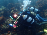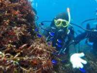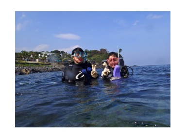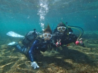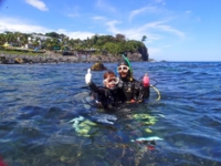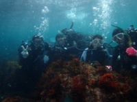 | お昼の休憩後はいよいよ体験ダイビングのスタートです。指導員から詳しい説明を受けた後、タンクを背負っていよいよダイブ!! | 陸上では重たいタンクも水の中に入ってしまうと、その重さはほとんど感じなくなってしまうのです。 | インストラクターに付き添われながら、ゆっくりとゆっくりと進んでいきます。 |