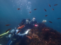 | 最初は少し不安なスキューバの呼吸にもすぐに慣れてしまいます。慣れてくると水の中にいる事を忘れてしまいそうです!! | インストラクターと共に少しずつ先へ進んでいきます。 | 廻りを見てみると、アオリイカの子供達の群れが、、、、、、 |