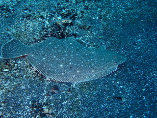この日は、8月の夏以来ののダイビングだった興野さん。前回はウエットスーツでしたが、今回は、ドライスーツに衣替えしてのダイビングでした。朝到着してウエイト確認したところ、ちょっと重そうだったので、申告いただいたキロ数から2キロ分マイナスしてのスタートでした。潜降の時にちょっと潜りにくそうだったので良く見ると、右腕が無意識で上がってしまっていて、空気が抜けきっていませんでした。右手を下げるように水中で指示した後は問題なく潜降できて問題なしでした。早速砂場に移動して、イワシの群れを上空に見ながら進んだ先で、最初に見つけたのがこの小さなヒラメでした。写真だと大きく見えますが、実際は20cm位の小さくてかわいいサイズの子供でした。最初は砂をかぶっていたので、少し手で動かして、砂から出てもらって撮影しました。すごくお行儀のよい子で、砂から出た後も、あまり動かずすぐ近くで撮影させてくれました。久しぶりの水中撮影で、あまりいろいろ考えずに撮影したのが良かったんでしょうね〜。撮影に迷いなくとても自然体で撮影されていました。出来上がった一枚がこの写真。全身を綺麗にバッチリ収めてくれました!伊豆の代表選手を綺麗に撮影した一枚をご投稿いただきありがとうございます!ダイビング後に、水中撮影のコツを伝授させていただいたので、次回のダイビングで試してみてくださいね〜!