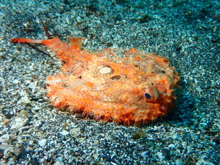 この日は、藤井さんの、今年の初潜りのダイビングでした。この頃は、少し深い水深からイズカサゴが上がってきて、大体いつも同じ辺りで砂場の岩に寄り添うように、動かず泳がずじっとしている事が多い頃でした。そこで一本めは、その辺を探しにいきましょうということでスタートしました。手前の浅い水深で、ホシテンスygやシマウミスズメなどを見て、そろそろ目的の水深に近づいた時に、オニオコゼを見つけて、まずは撮影してもらいました。その後、いよいよイズカサゴを探そうと思った時に、何やら茹でたカニの甲羅のようなオレンジ色の物体を発見。近づいていくとなんと、そこにいたのは、超珍しい「深海魚のアカグツ」でした。毎日潜っているガイドでも一生のうちに一度か二度くらいしか見る事のできない生き物の出現に藤井さんよりも私の方が興奮して、360度全方向から写真を撮影してしまいました。横から見ていた藤井さんの方が冷静で、明るいライトを照らしながらのんびり撮影されていました。私が撮影する時に、撮りやすいようにライトを照らしてくれたほど、藤井さんの方が余裕がありました。そのライトを照らして、藤井さんが明るく綺麗に撮影してくれたのがこの一枚。奇跡の出会いを収めた貴重な一枚。藤井さんご投稿いただきありがとうございます。こんな出会いがあるから、ダイビングはやめられませんね〜。藤井さんまた次回のご投稿もよろしくお願いします!