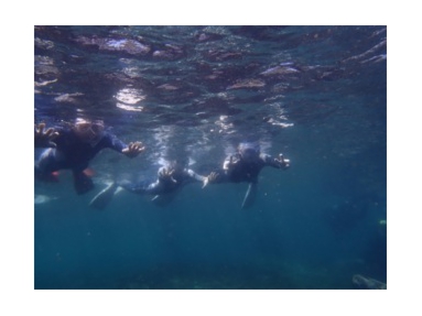 | 初めてフィンを履いて、水の中で動かしてみましょう!! 水の抵抗で足が重く感じますが、その抵抗で泳ぐ事が出来るのです。足の動かし方の説明を聞いて、デモンストレーションを観て、そして動かしてみましょう!! | いよいよ実際に泳いでみます。足の力を抜いて軽く大きく動かしてみると、なんと少ない力で泳ぐ事が出来るのです。水泳が苦手の人でも驚くほど楽に泳げる事に気が付くはずです!! | プールでフィンスイムの練習が終わったらいよいよお待ちかねの海でのスノーケリングです!! |